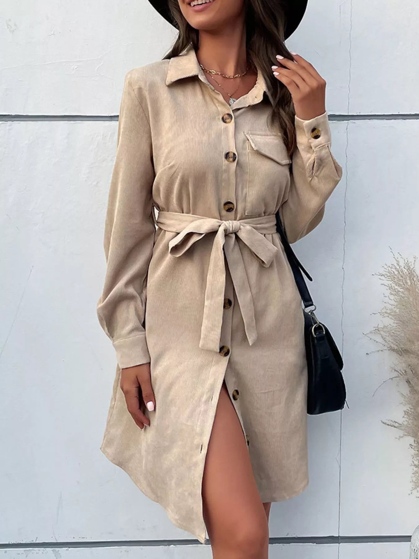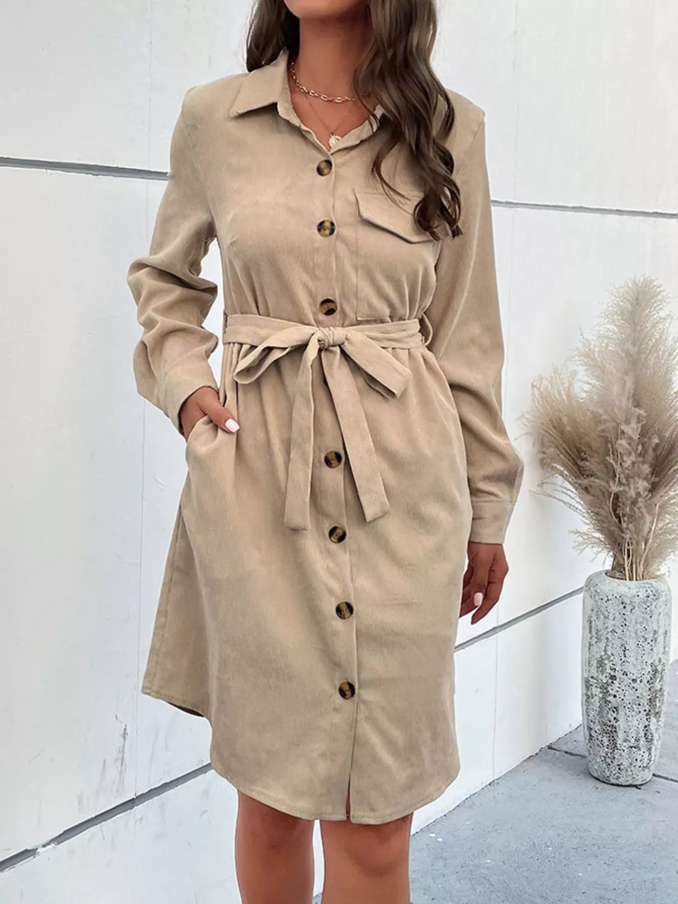 Button-Front Tie Waist Shirt Dress