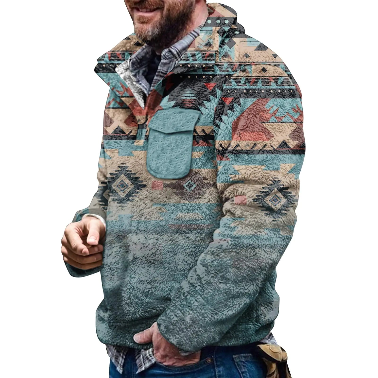 Mens Aztec Fleece Jackets Pullover Sweatshirt Warm Tops Graphic Print Fuzzy Winter Coats Vintage Sweater with Pocket